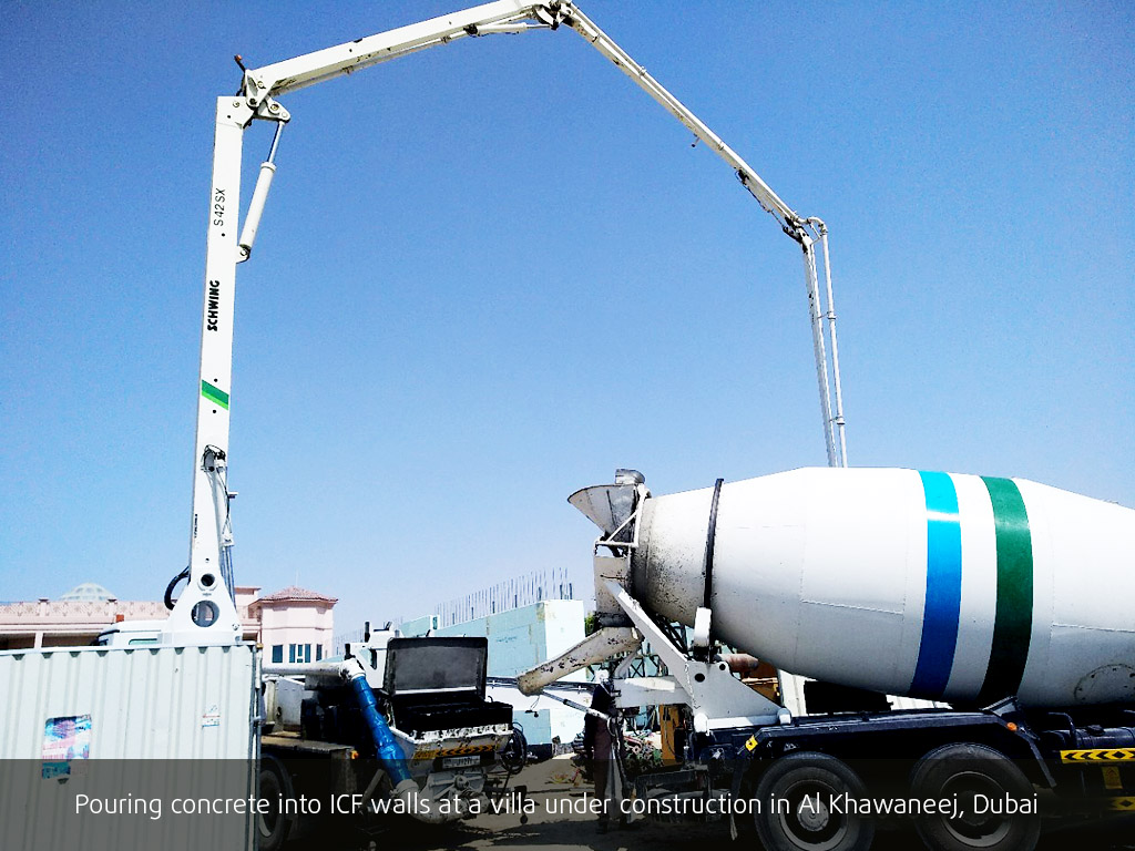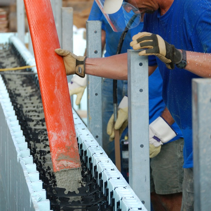 A concrete pump is used to fill the core of the forms. Once the concrete dries, the result is immensly stong reinforced, monolithic concrete wall.