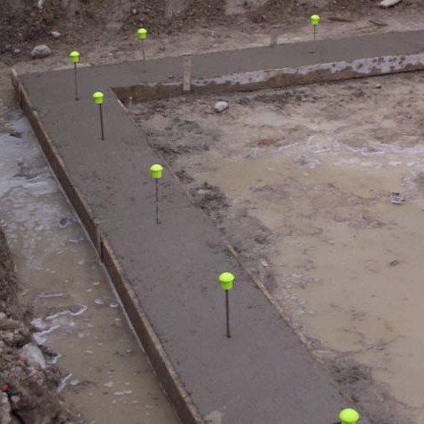 A strip footing foundation is prepared. Strip footings are generally easier to setup than the isolated footings found in traditional construction.