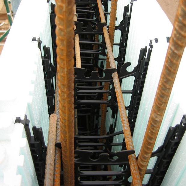 Horizontal rebar is clicked into place along each course. When the wall height is finsihed the vertical rebar is fed through.