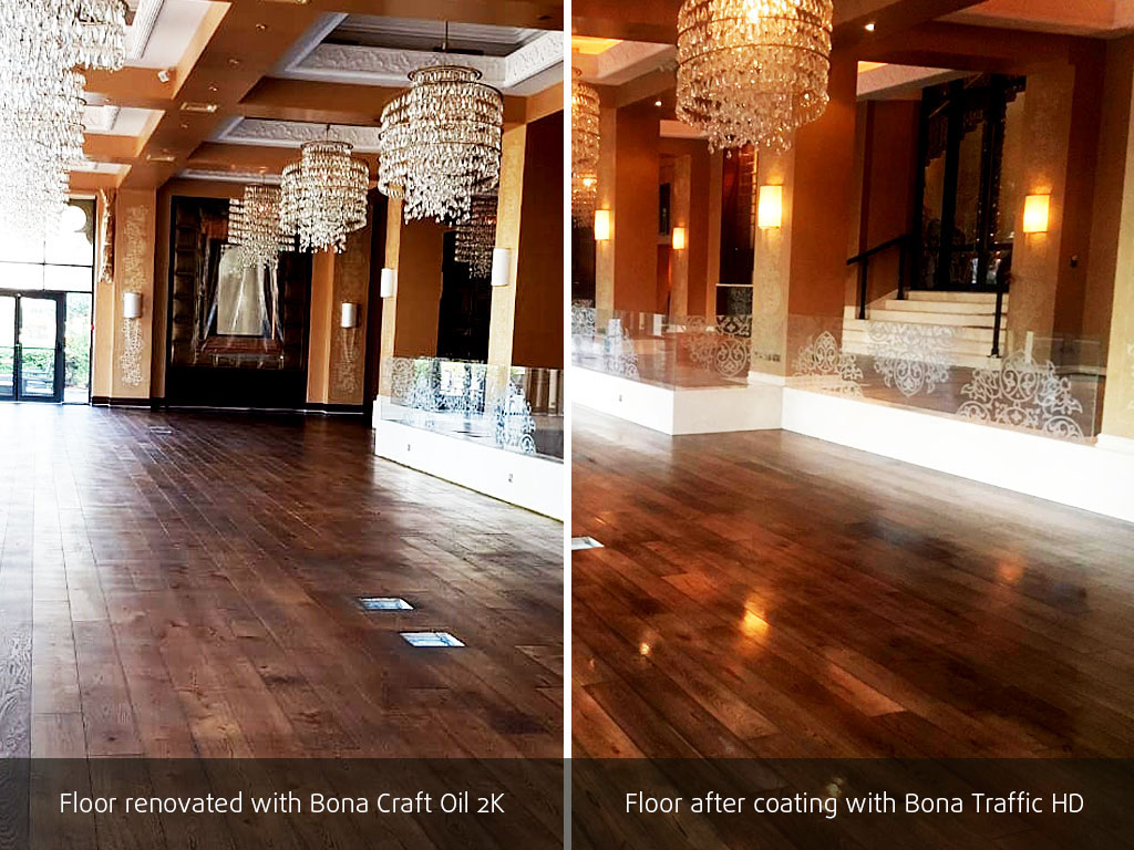 Over time, frequent cleaning can diminish the appearance and quality of the surface. A new protective layer reinstates the original luster and extends the lifespan of floors. It's a safe, quick, and easy process. The innovative Bona Protecting Treatment offers an effective solution for reviving lackluster wooden floors. With remarkable results and a fast turnaround, the floor is ready to be walked on in as little as half a working day.
